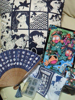 クッション、扇子、手ぬぐい、薬入れ、ペンケース、下敷き。